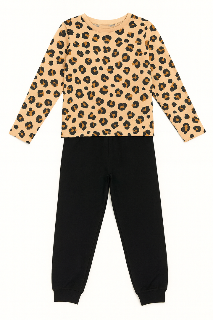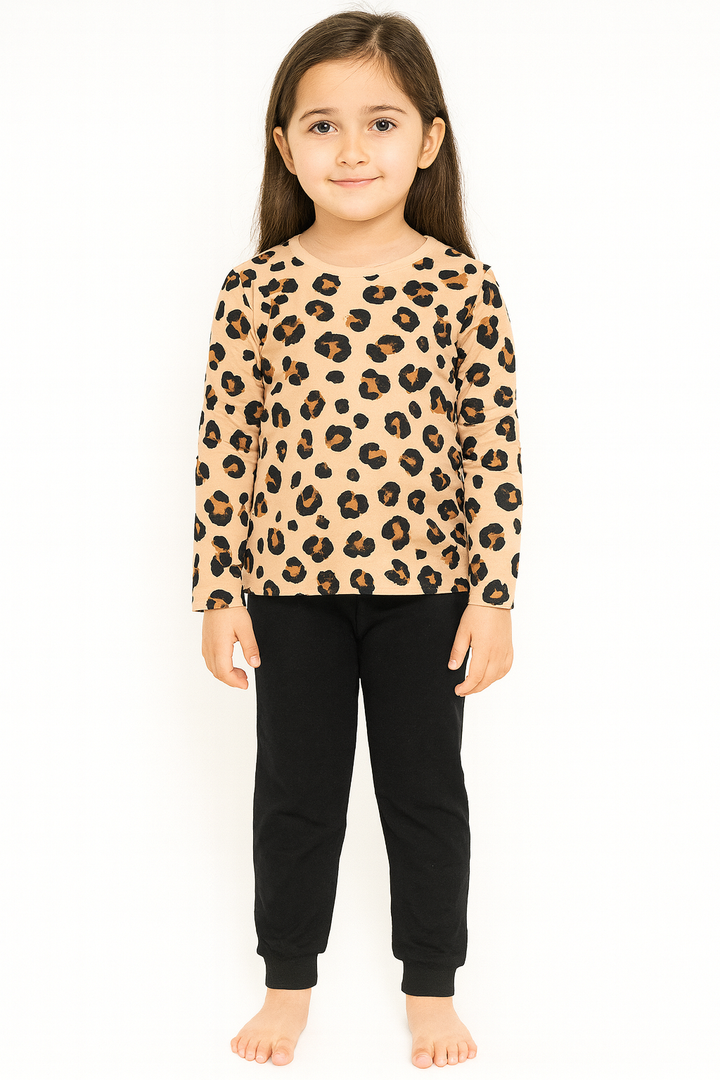 Girls Leopard Print Pajama Set – Beige Animal Print Top & Black Pants | Kids Nightwear