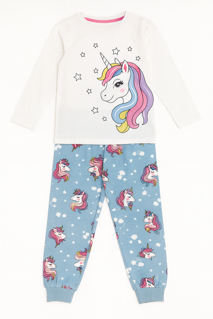 Girls Unicorn Pajama Set – White Long Sleeve Top & Blue Pants | Cute Kids Nightwear