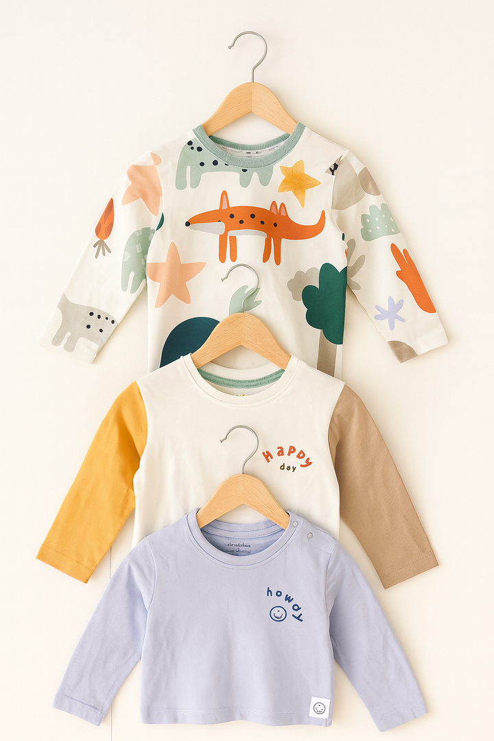 Add a playful touch to your little one’s wardrobe with this Primark Boys 3-Pack Long Sleeve Tops – Happy Dino & Howdy Smile Collection. Made from 100% soft cotton, these comfy tops are perfect for everyday wear, playtime, or casual outings.
