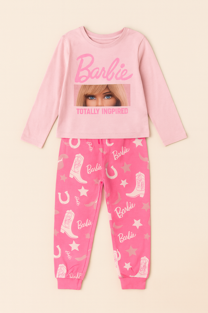 Make bedtime stylish and fun with this girls’ Barbie pajama set featuring a trendy “Totally Inspired” pink long-sleeve top and matching printed trousers. Designed with Barbie graphics, stars, boots, and horseshoes, this set brings a playful western twist to classic nightwear. Crafted from a soft and breathable cotton blend, it keeps your little one comfortable all night long, whether she’s sleeping, lounging, or having a fun sleepover.
