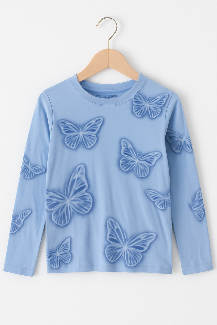Add a flutter of charm to your little one’s wardrobe with this Girls Blue Airbrush Butterfly Long Sleeve Tee. Made from soft, breathable cotton for all-day comfort, this sky-blue top features a dreamy all-over butterfly print with a trendy airbrush effect. Perfect for layering or wearing solo, it’s an easy win for school days, playdates, or weekend adventures. Pair it with jeans, leggings, or joggers for an effortlessly cute look.