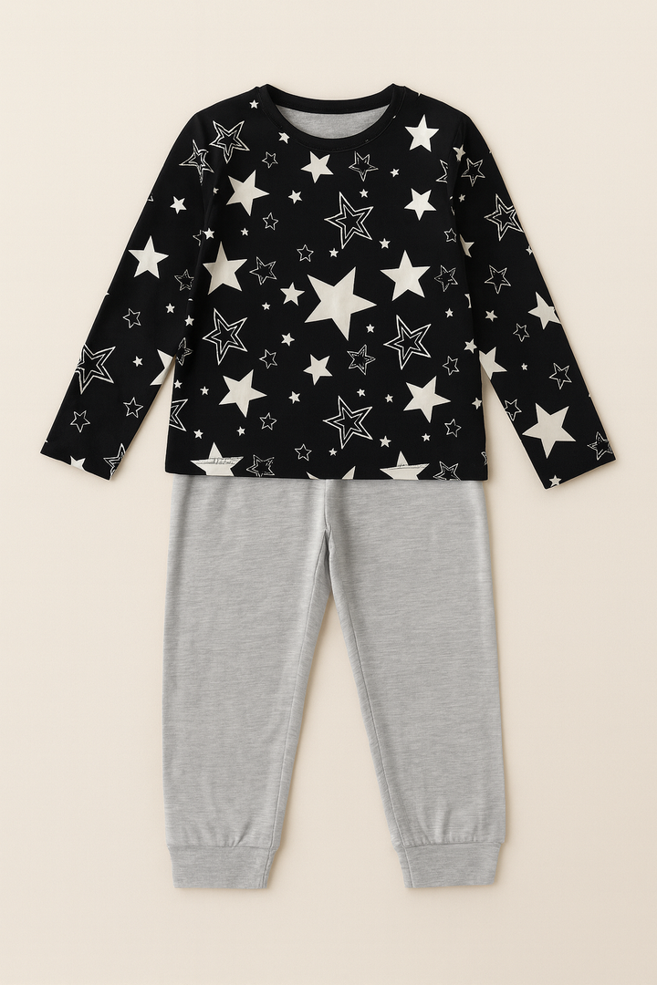 Your little one will shine in this girls’ black star print pajama set, designed for cozy nights and sweet dreams. The set includes a long-sleeve top with a bold star design and soft grey cotton trousers with ribbed cuffs for a snug fit. Made from breathable, skin-friendly fabric, this nightwear ensures comfort all night long while adding a stylish touch to bedtime. Perfect for sleepovers, lounging, or everyday wear.