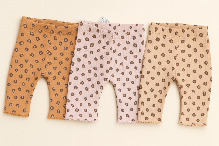 Add a touch of cuteness and comfort to your baby’s everyday wardrobe with this 3-pack of ribbed leggings from George. Designed in soft, stretchy cotton fabric, each pair features a playful leopard print pattern in beautiful neutral tones — caramel brown, blush pink, and light beige. These leggings are perfect for mixing and matching with tops, bodysuits, or jumpers for an adorable everyday look.