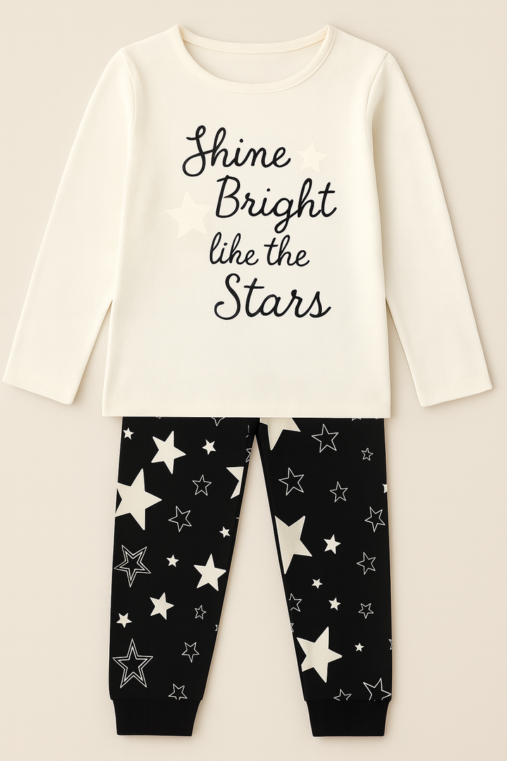 et your little star shine bright in this adorable girls’ star print pajama set. Featuring a soft cotton long-sleeve top with the sweet slogan “Shine Bright like the Stars” and comfy trousers, this nightwear set is perfect for cozy evenings and peaceful sleep. The breathable fabric ensures comfort all night, while the stylish star design adds a fun and playful touch. Ideal for everyday wear, sleepovers, or gifting.