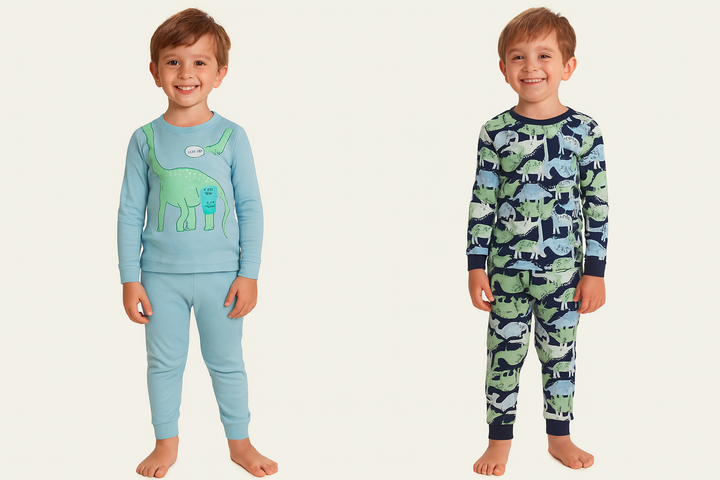 - PJ Set 2: Playful dino-patterned design in green, blue, and white.